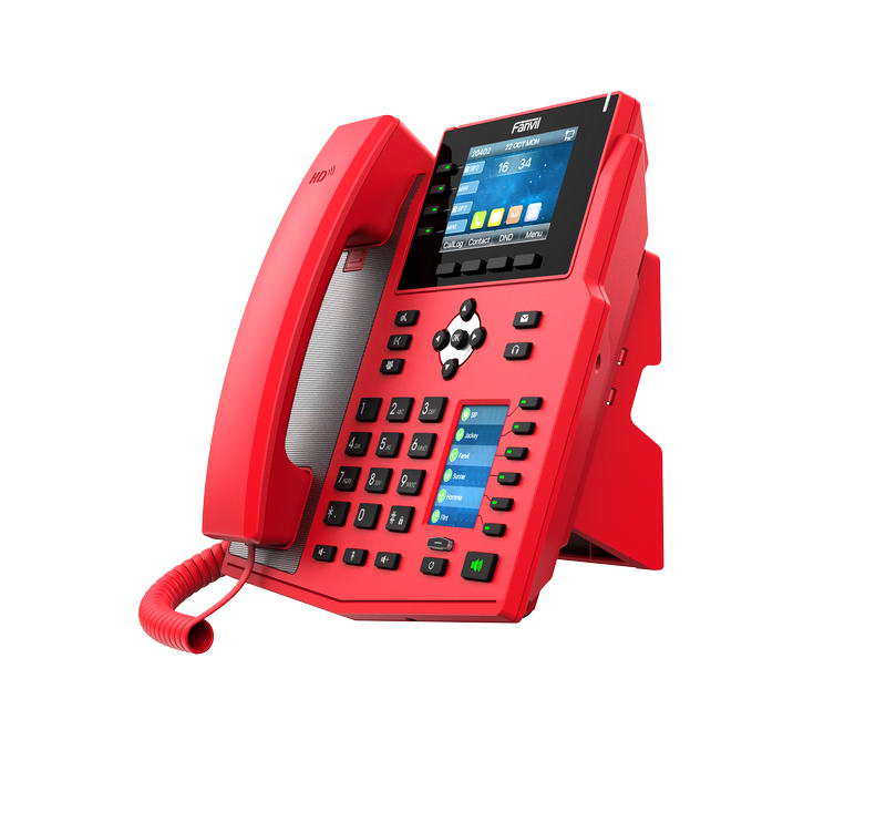Elegantní červený Fanvil X5U-R s 3,5“ barevným displejem a 2,4“ barevným bočním displejem a 30 programovatelnými tlačítky s LED indikatorem vám v případě nouze poskytuje intuitivní přístup k různým funkcím.
